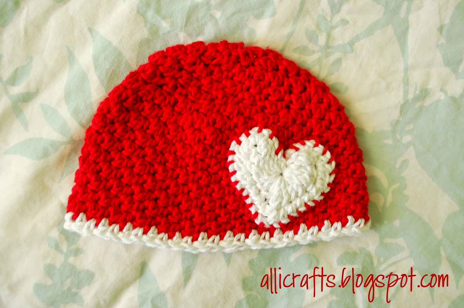 For my Valentine's theme, I got my idea from this gorgeous picture of an item no longer available on Etsy. I made my hat in red, changing to white for the last round, and added a heart applique from Skip to My Lou - though I only did rounds 1 and 2, leaving off the last round. Perfect for a Valentine's baby!